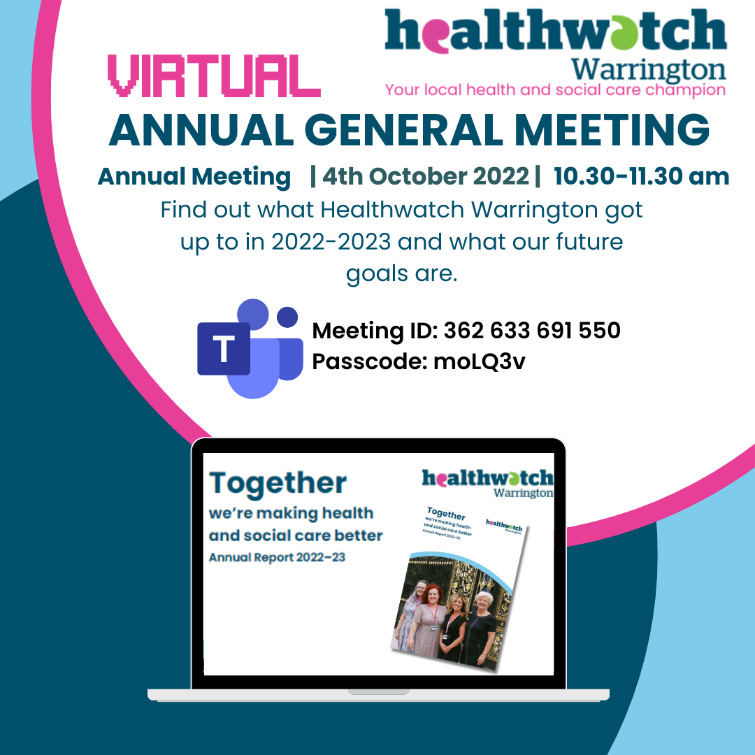 Healthwatch Warrington Invite you to join them on Wednesday 4th October 2023 10.30 am on Teams to hear about their achievements in 2022-2023 and their plans moving forward.